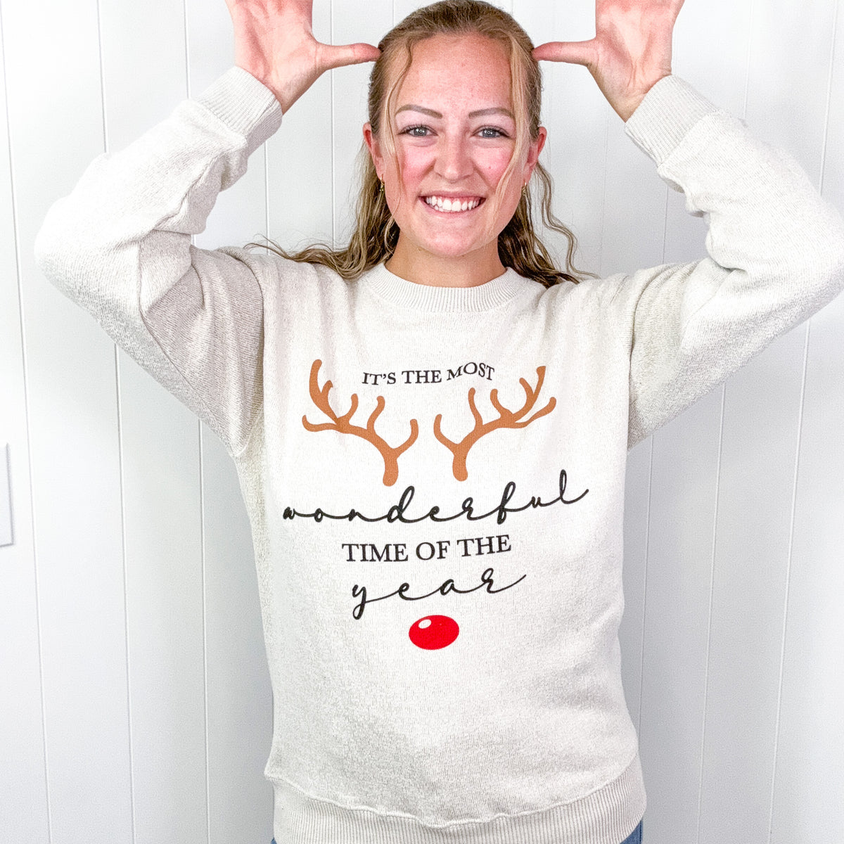Celebrate the holidays in style with this luxurious Oatmeal Wonderful Time Of The Year Sweater. Featuring an exquisitely crafted super soft fabric, this timeless Christmas sweater is professionally screen printed for long-lasting quality. With its ribbed hems and cuffs, this stretchy high-end knit is perfect for the holiday season.